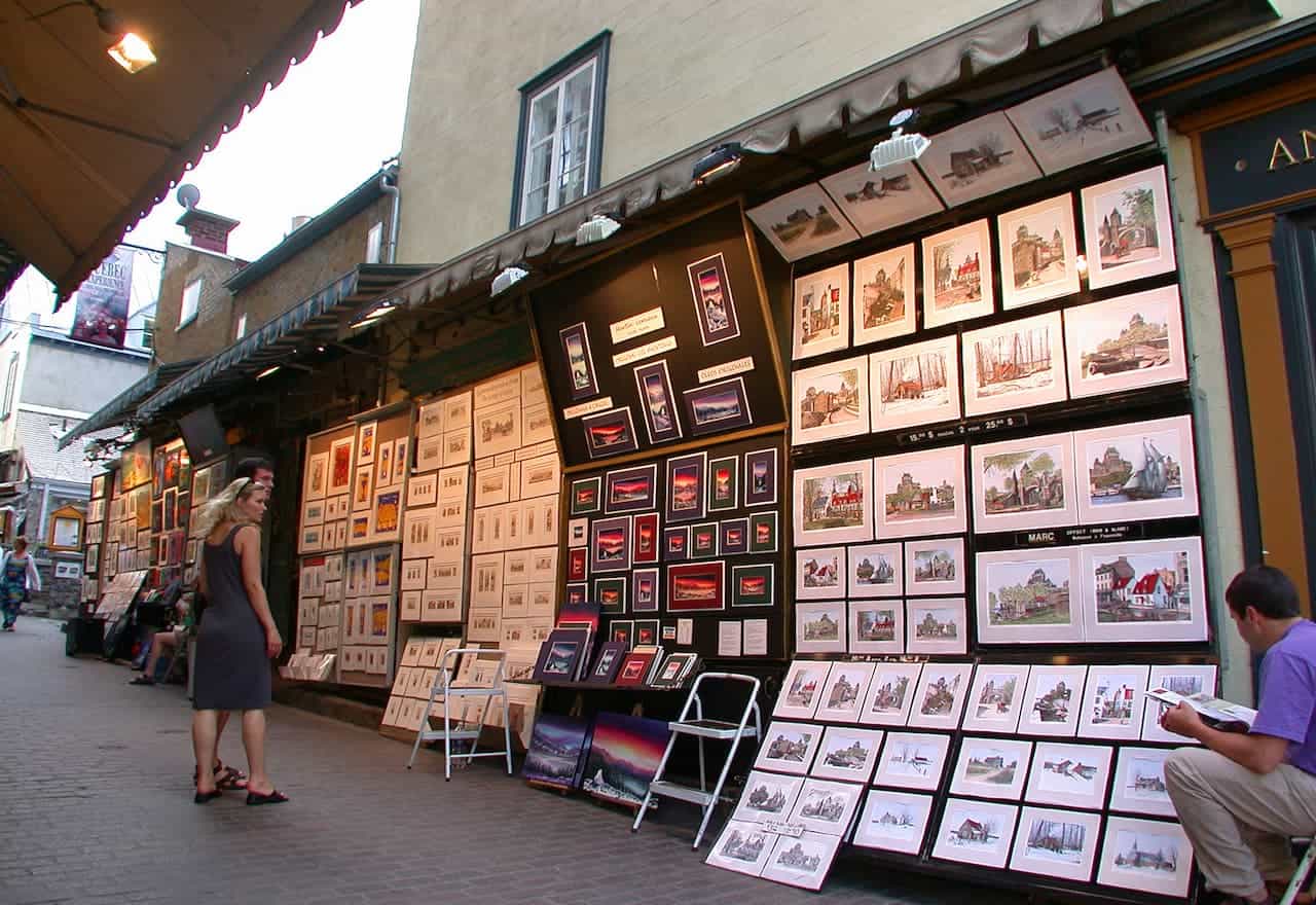 Rue du Trésor is one of Quebec City’s most distinctive streets. Short, pedestrian only, and lined with stone walls, it functions as an open air studio where artists work in full view of passersby. Paintings lean against the walls, easels line the walkway, and conversations unfold naturally between creators and visitors.